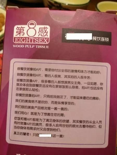 张女士提供的照片显示,纸巾盒证明写着第8感,背面还写有“做餐饮就像拍A片,需要你付出全部的激情和体力才能拍好”等字样。 (来自:襄阳广播电视台)