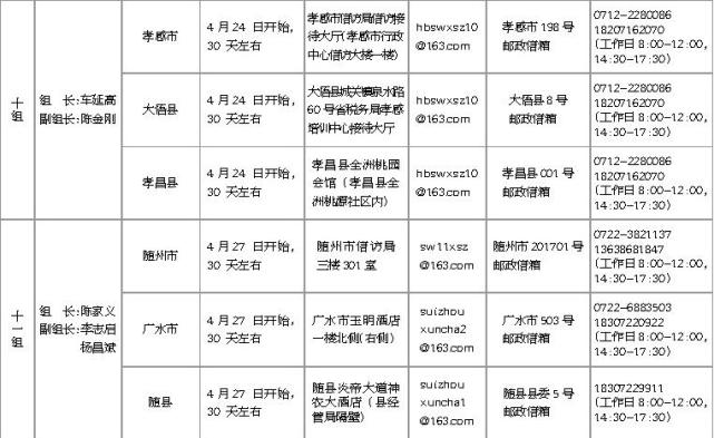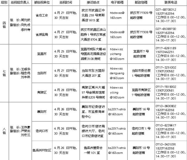 (杨宏斌、通讯员王婧、陈雨)根据省委统一部署,4月24日至27日,省委第四、第七、第八、第十、第十一巡视组分别进驻省总工会、省质监局、宜昌市、襄阳市、孝感市、随州市及当阳市、夷陵区、老河口市、鱼梁洲开发区、大悟县、孝昌县、广水市、随县开展巡视“回头看”,并召开了巡视工作动员会。