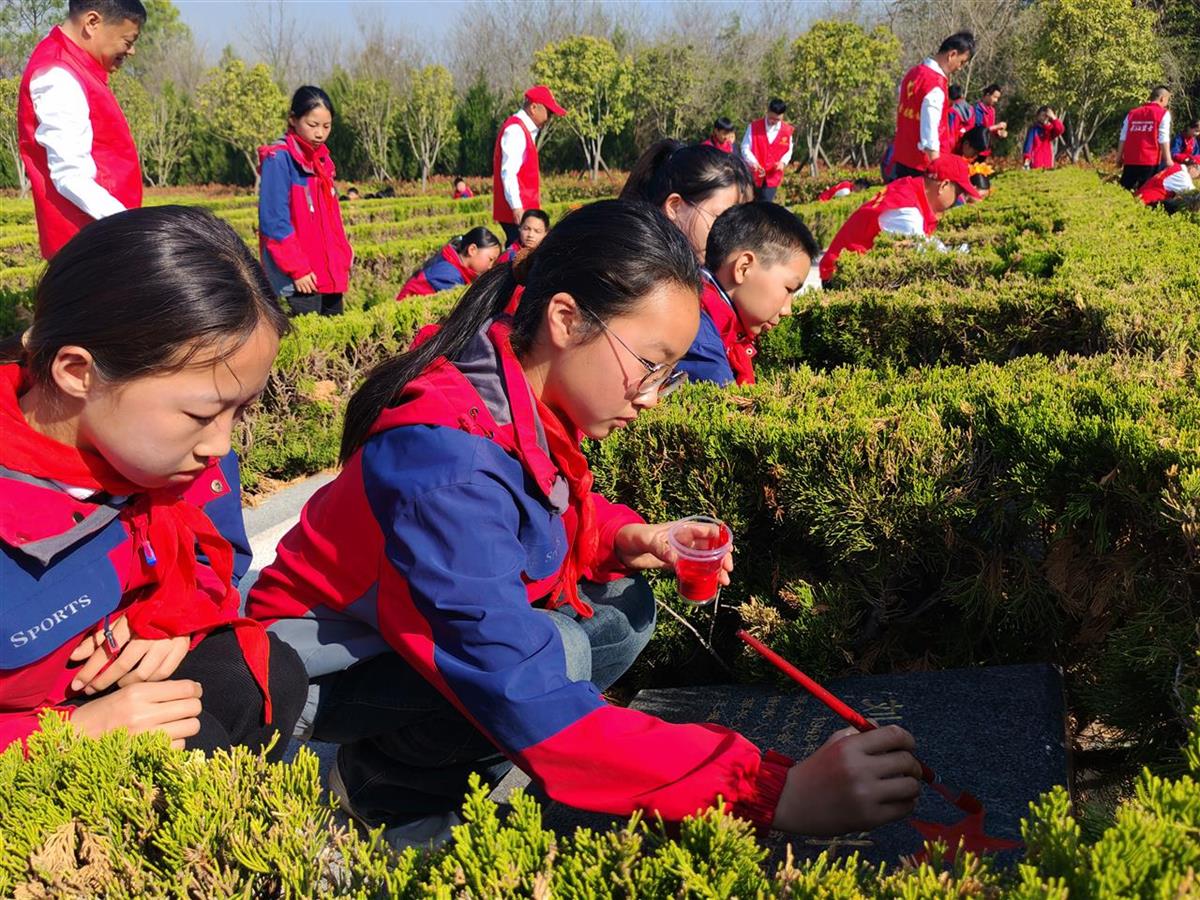 枣阳市英烈园内庄严静谧,175座烈士墓在翠柏林中整齐排列。烈士陵园讲解员为退役军人志愿者和师生讲解了枣阳籍烈士程克绳的光荣事迹。全体人员整齐列队,怀着无比敬仰的心情面向烈士墓鞠躬默哀,深切缅怀烈士们的丰功伟绩。随后,一名退役军人志愿者和两名学生组成一组,或弯腰俯身、或单膝跪地,擦拭墓碑上的灰尘后,拿出准备好的笔和红漆,一笔一画为烈士碑文描红,感悟烈士伟大的牺牲奉献精神。描红结束后,大家对英烈园内杂草和枯枝进行清理,营造干净、整洁的祭扫环境。