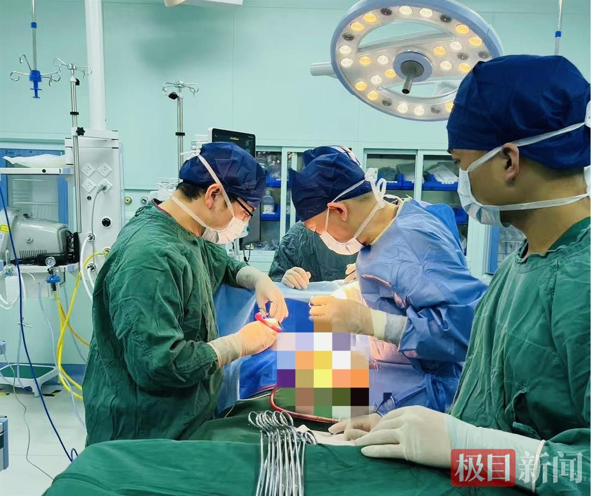 医生与汪婆婆及家属进行了充分沟通,汪婆婆同意接受手术。由于婆婆年岁已高,又有基础性疾病,术前,经过医院临床营养科、肿瘤科、麻醉科等多学科会诊评估,制定了完备的手术方案。由陈大兴主任主刀,汪婆婆在全身麻醉下,接受了左侧乳腺癌根治术+带蒂皮瓣移植术,手术过程较为复杂,术中取婆婆左侧乳房肿块表面,通过3厘米类圆形切口进行探查,结果发现肿块质地硬,大小约12厘米×10厘米×10厘米。