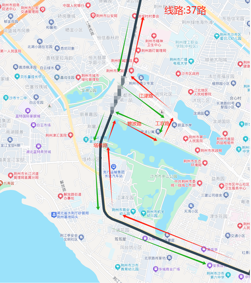 15路绕行景明观路、武王大道、荆沙大道,不停靠“金凤广场”、“荆州古城游客中心”站点。