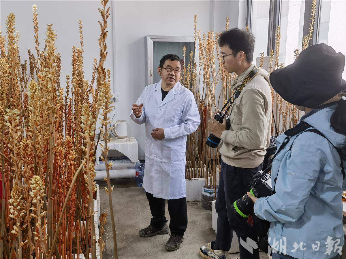 神农架道地药材天麻育种实验室,公司常务副总经理郭永兵正在向来访者介绍天麻育种杂交授粉。(通讯员龚俊摄)