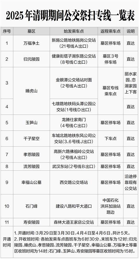 专线各始发点发班时间为6时30分至12时;归元陵园、睡虎山、孝恩陵园、流芳陵园、千子星空、幸福山公墓、万福净土等墓区收班时间为14时;石门峰、玉笋山、寿安陵园等墓区收班时间为15时。
