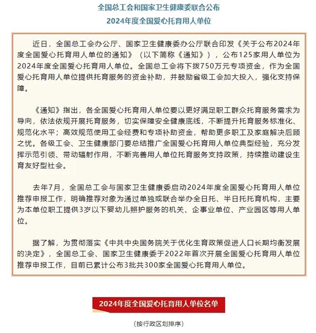 据悉,为贯彻落实《中共中央国务院关于优化生育政策促进人口长期均衡发展的决定》,全国总工会、国家卫生健康委于2022年首次开展全国爱心托育用人单位推荐申报工作,目前已累计公布3批共300家全国爱心托育用人单位。