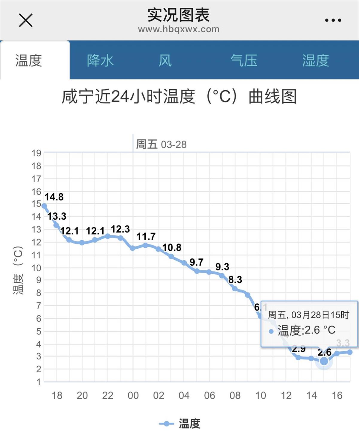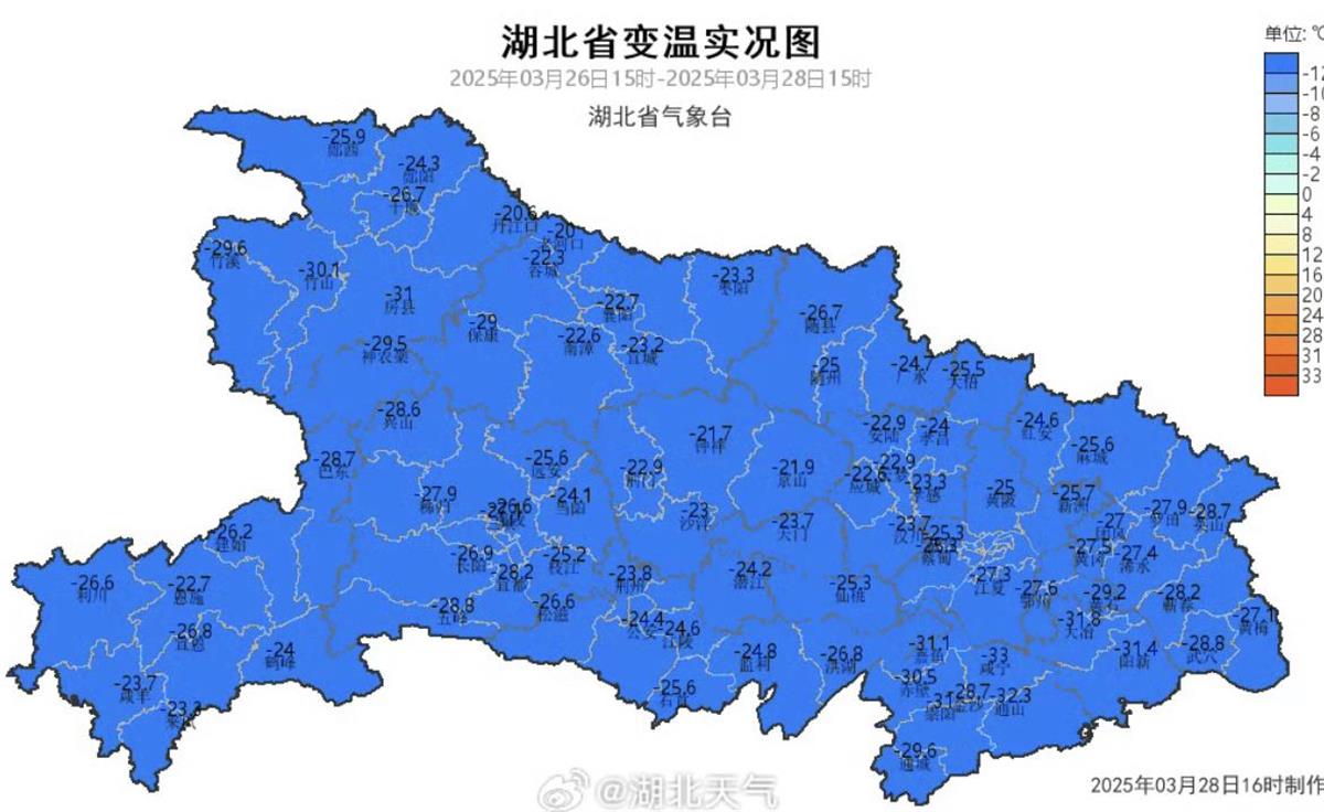 这是妥妥的满30-20,甚至有些地方是满35-30,咸宁降温幅度最大,前日下午3时气温35.6°C,今天仅2.6°C,48小时降了33°C。武汉26日15时气温33.9℃,今日15时气温仅8.6℃,武汉降温幅度达25°C。