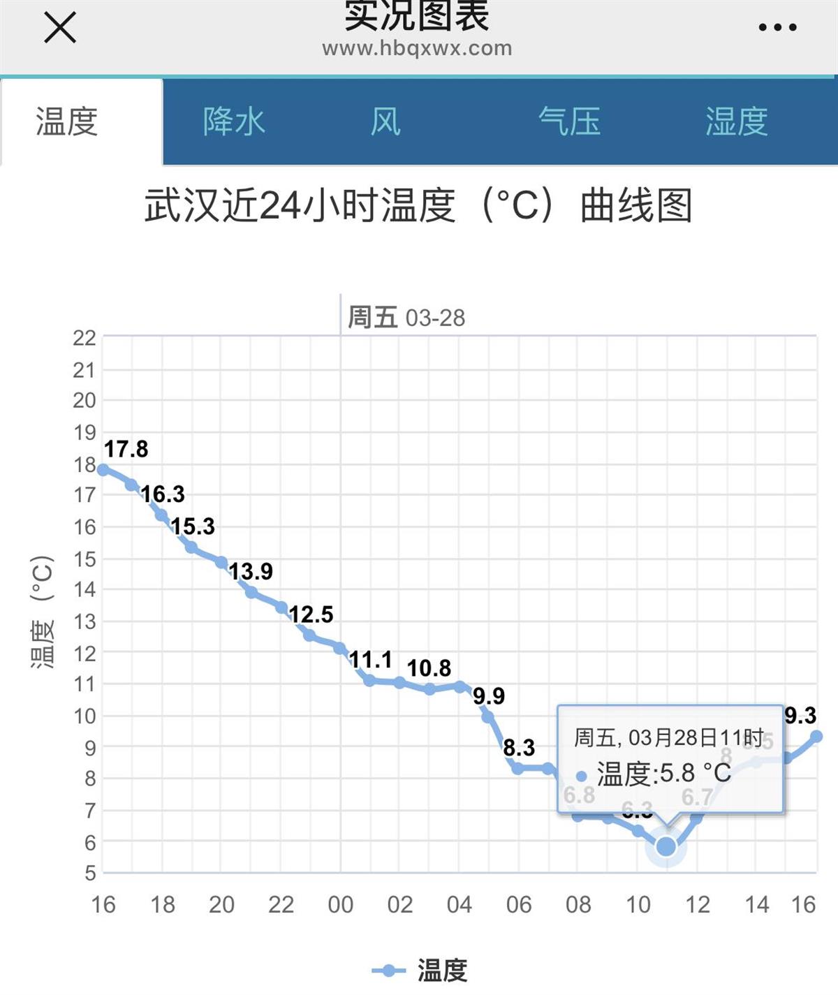 天气太极端,忙拿厚衣穿。如果说昨天穿外套即可,可在今天的冷风冷雨中,有些朋友不得不穿上薄羽绒服了吧。截至今天下午4时,武汉气温都是个位数,早间8时尚有6-8°C,最低点是中午11时的5.8°C,下午4时回升至9.3°C。