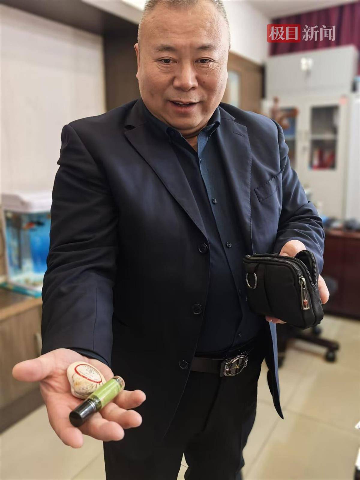 “很多老同志身体都不太好,大药箱我也准备着。”说到办公室的大药箱,刘兴荣说,不仅办公室备着,22年来,他自己还随身携带一个小药包,放在裤子口袋里。哈利油、速效救心丸、硝酸甘油……这个刘兴荣随身携带的黑色小包,手掌大小,里面塞满了药品,“有的老同志手掌干燥,可以擦哈利油,速效救心丸就是以防万一。”他一一解释。