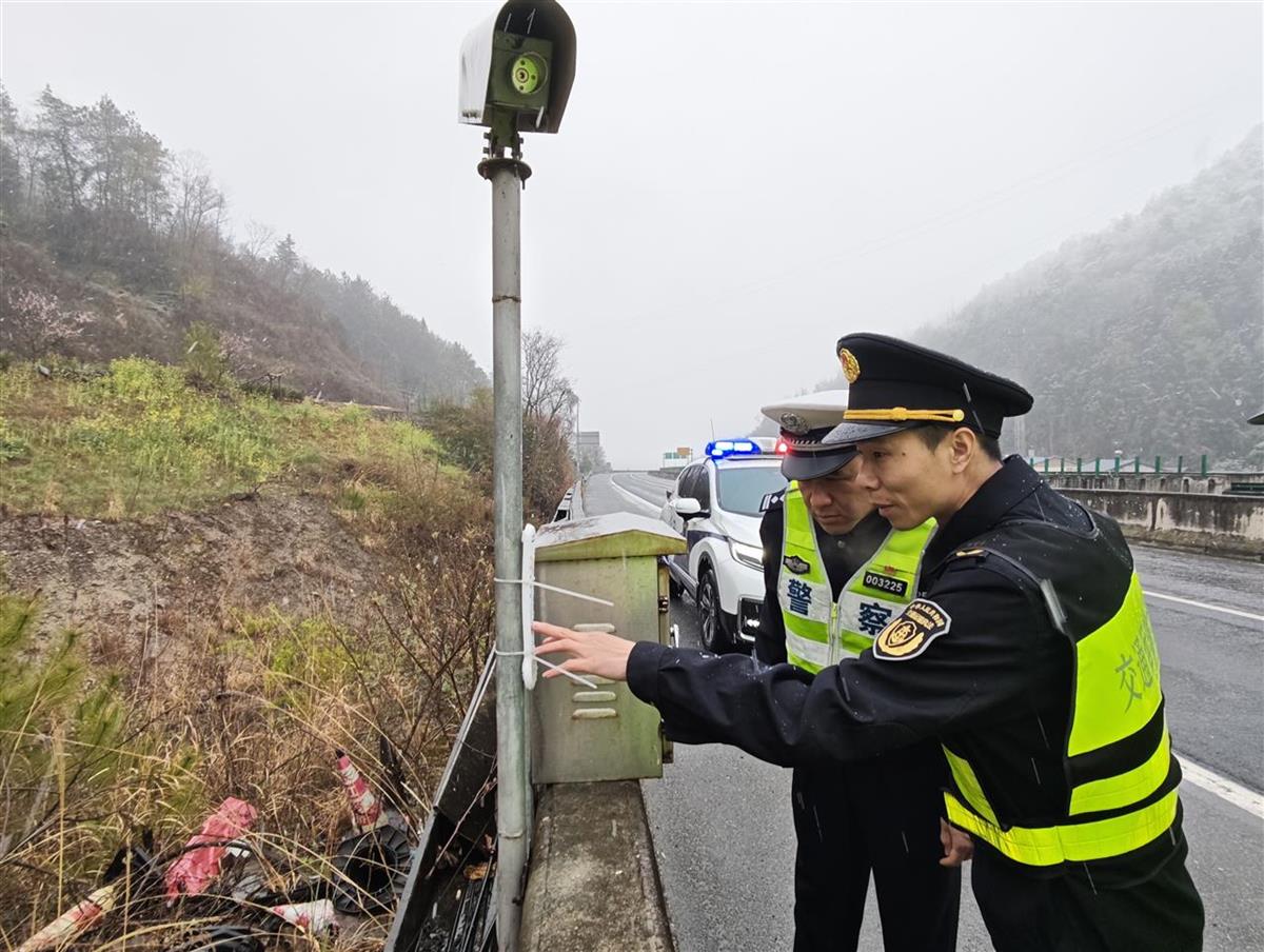 09时30分,结合巡查人员信息反馈,雪情有增大趋势,温度已经0℃。大队随即安排另一组应急人员联合省高警夷陵大队到重点路段踏勘,并商议在界岭隧道入口、燕子隧道入口实行重点路段定点值守,开启警报器、警灯、扩音器,查看路况和天气信息,提醒过往司乘谨慎安全驾驶。养护部门在重点路段布控并人工撒布融雪剂,防止路面结冰。