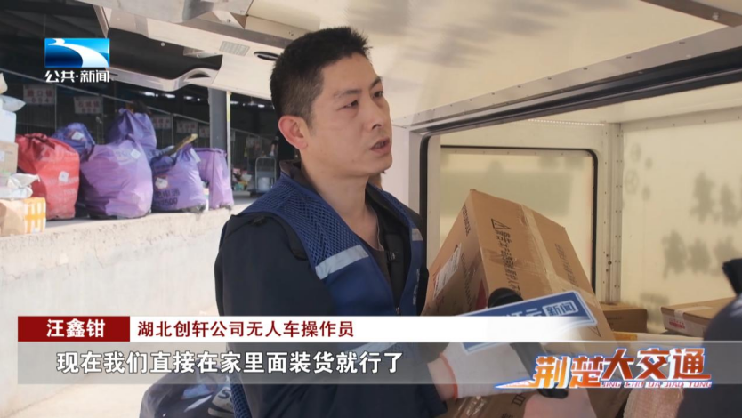 湖北创轩公司无人车操作员 汪鑫钳:“以前都是用人工配送,自己装车自己配送,每天要跑二十多个点,现在我们直接在家里面装货就行了。”凭借以前送快递的经验,他按照到达村级站点的远近,从车厢里往外装货,一个村一个包并标注村名。