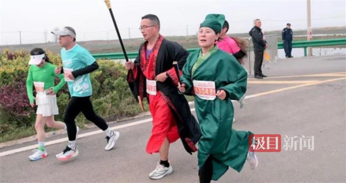 赛事凸显“体育+文旅”特色:选手凭号码布可畅游梁子岛、凤栖绿洲等景点;赛道补给站提供非遗谢埠千张、梁子湖鱼圆等地域美食;885名高校志愿者化身“湖城名片”,在检录、补给等岗位提供全流程服务。更有多位身着历史人物服饰的“显眼包”与选手互动,红衣鼓阵沿湖助威,营造出传统与现代交融的赛事氛围。