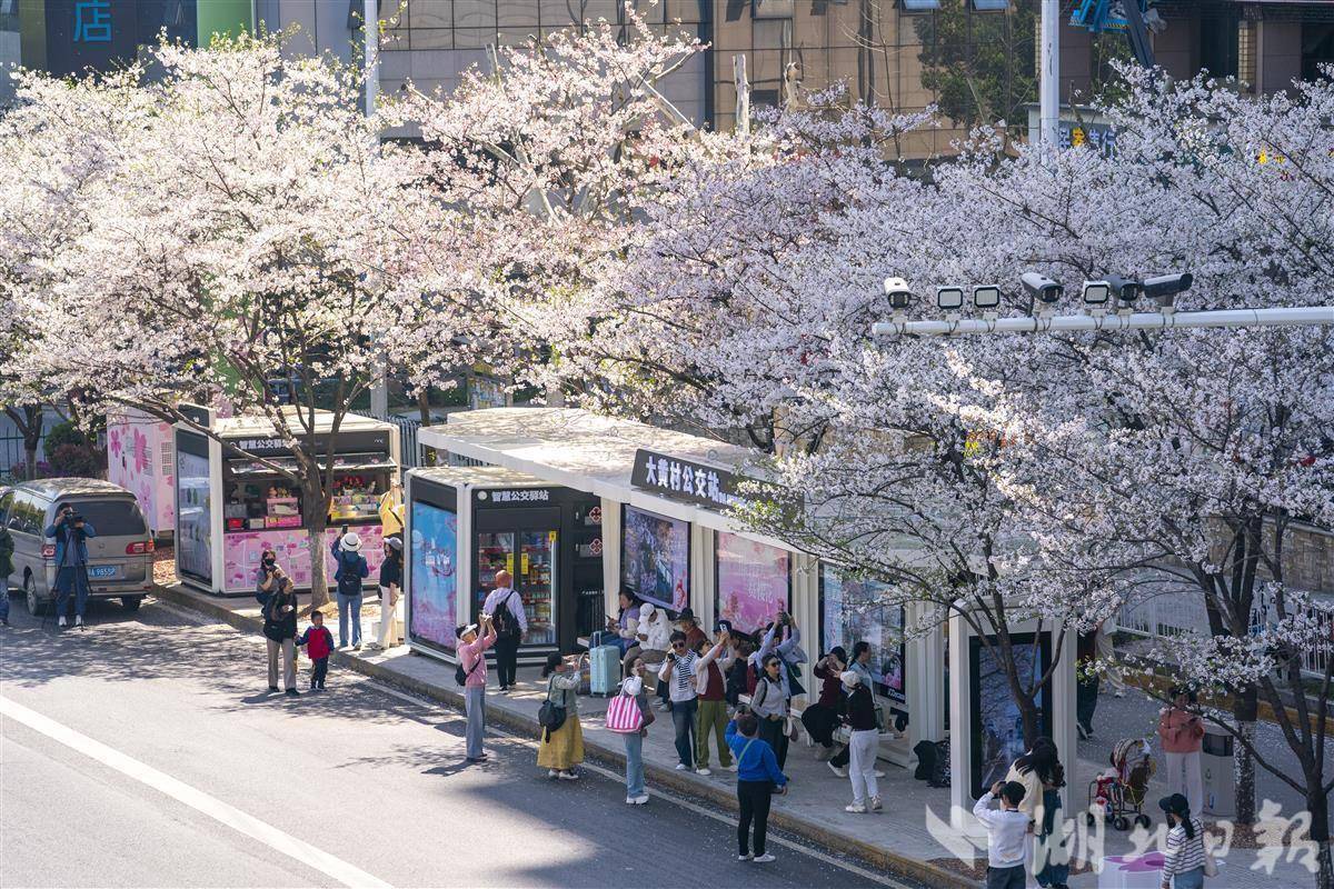 大黄村公交站,市民、游客在樱花环抱、焕然一新的白粉色站台上赏花、打卡、拍照。(湖北日报全媒记者魏铼通讯员黄珍摄)