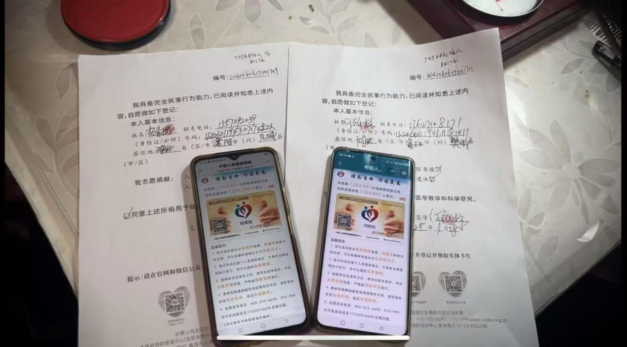 3月28日上午,襄阳市83岁的杨青娥和84岁的何所柱完成了人体器官捐献志愿登记表的签署,成为全国第7054831和7054841位捐献意愿登记者。