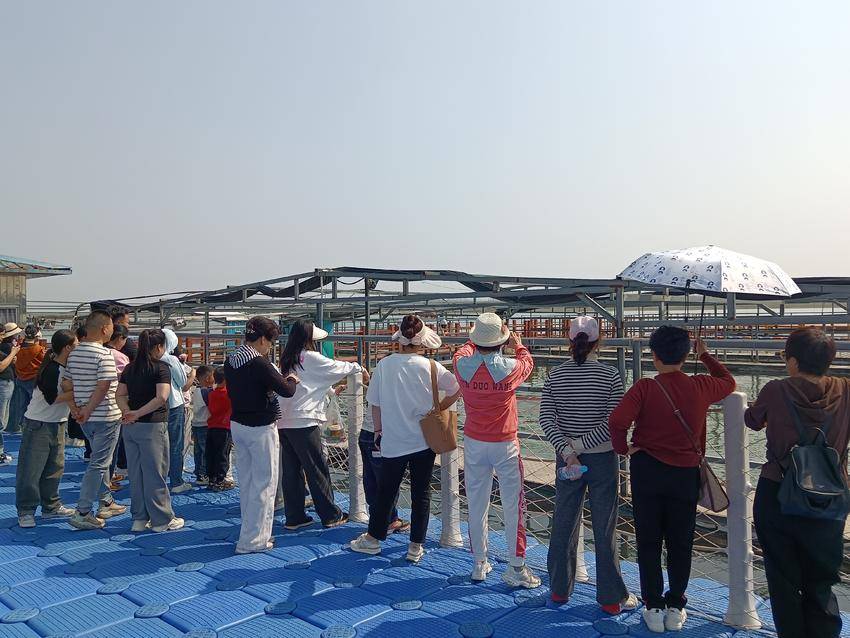 在检票入口,来看江豚的游客队伍排成长龙。大家步行至观赏区外围,纷纷拿出手机,准备抢拍江豚跃浪的欢快瞬间。江豚时而仰泳翻腾,时而追逐嬉戏,引得游客阵阵欢呼。