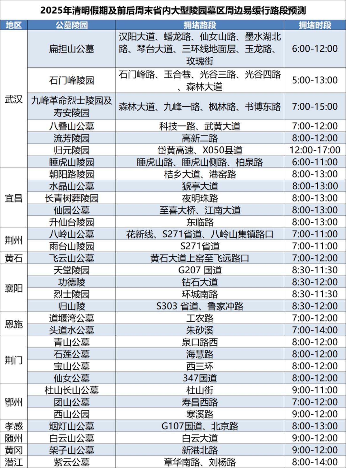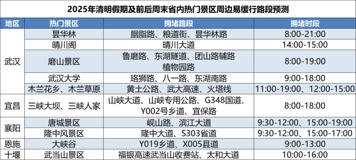 G316国道孝感、襄阳段,G318国道潜江、恩施段,S312省道宜昌段,S104省道武汉段,黄冈城北路,黄石矿冶大道,孝感荷沙复线等路段拥堵风险较高。