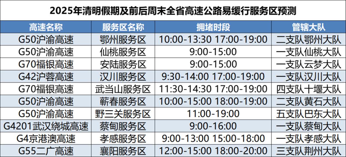 G50沪渝高速仙桃、鄂州、长阳、黄石段,G4201武汉绕城高速江夏、蔡甸段,G4京港澳高速孝感段,G70福银高速云梦段,G42沪蓉高速汉川、黄陂段,S7武鄂高速,G4221沪武高速江岸、罗田段,S1岱黄高速,S8关豹高速江夏段,G55二广高速荆门、襄阳段等高速拥堵风险高。