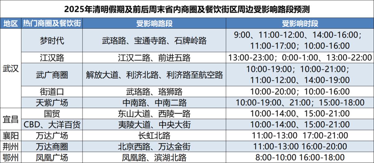 一是进出城高速路口,陵园、墓区、景区、商圈周边道路拥堵指数高,返乡、祭扫、郊游等出行交织叠加,高速公路交通流量将大幅上升。