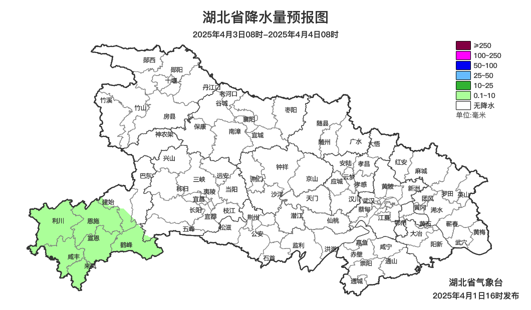 4月4日08时-5日08时,全省多云,其中鄂西南白天有短时小雨。最高气温恩施地区17~20℃、其他地区21~24℃,最低气温西部8~12℃、中东部12~15℃,偏南风转偏北风2到3级。