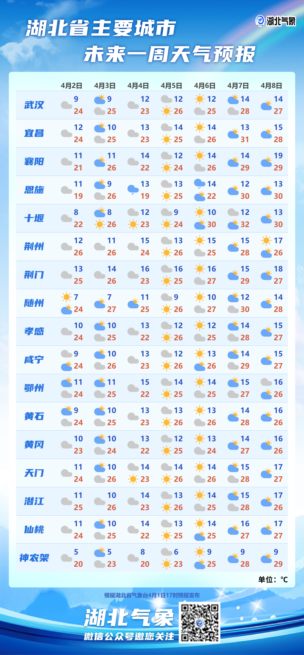 4月2日08时-3日08时,全省多云。最高气温20~25℃,最低气温7~12℃,偏北风3级。