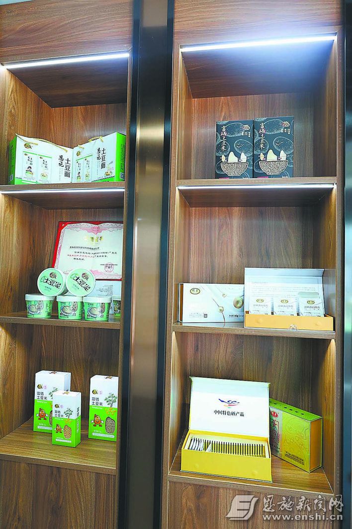 原料储存库内,10余吨马铃薯富硒蛋白原料整齐排列,等着被运送到生产车间;公司展厅里,土豆泥、土豆面、土豆米等马铃薯加工产品琳琅满目;生产车间内,机器轰鸣,硒土豆植物饮料、富硒蛋白肽片、富硒蛋白肽固体饮料等产品有序生产。