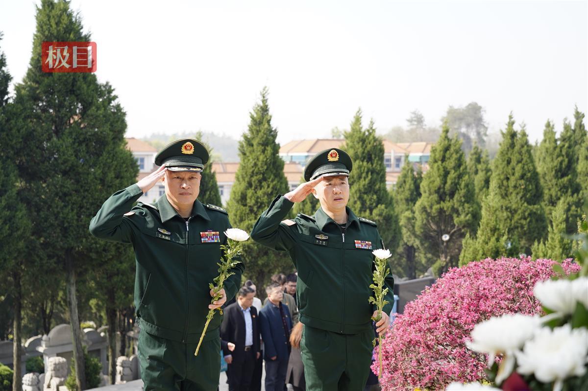 4月2日,湖北鄂州春寒未散,武警鄂州支队官兵列队肃立于团山公墓。青松翠柏间,两座墓碑静立,这里长眠着两位抗洪英雄——原武警鄂州市支队政委吴明、参谋长吉宏善。官兵们手持白菊,面向纪念碑庄严敬礼,誓言铿锵:“传承英雄精神,永做忠诚卫士!”