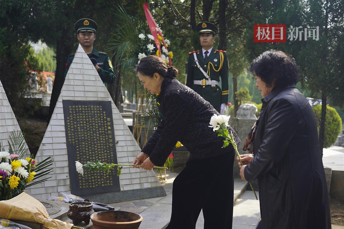 吉宏善妻子逯琳(前左)墓前献花