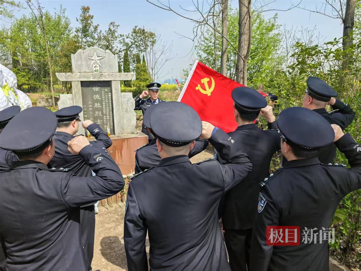 同一天,黄石市公安局经侦支队全体民警来到烈士徐德胜的墓前开展祭扫活动,以庄严仪式追思战友、寄托哀思。全体人员脱帽默哀、敬献花圈,重温入党誓词,彰显着经侦民警继承英烈遗志、忠诚履职担当的坚定信念。1999年,徐德胜在追捕逃跑嫌疑人时壮烈牺牲。当年被湖北省政府追记个人一等功,并被追认为革命烈士。活动中,经侦支队办公室主任陈舟现场讲述了曾经的战友徐德胜烈士英勇牺牲的感人事迹,号召全体民警以英烈精神为指引,将忠诚信仰转化为守护经济安全、服务高质量发展的实际行动。