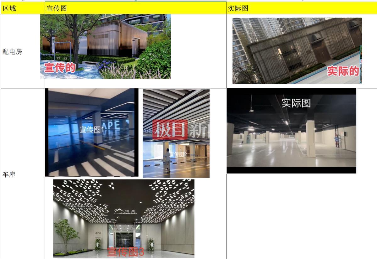 二是反映公区减配。业主们表示,此前公区配电房外饰的宣传图为格栅铝板,看起来高级美观,实际交付却只用竹子遮挡。前期购房时看的地下车库样板区域,车库为星空顶和金属铝栅格吊顶以及隐形LED灯条吊顶,可到交付时车库却漆成黑顶,之前的样板区域也已拆除。此前的外立面宣传图中,楼栋每层都是有铝板+金色栅格,实际交付只做到了4楼。此外,销售人员向业主展示的架空层规划,宣传中有低龄儿童活动区、大龄儿童活动区、折纸主题书屋、健身器械等,实际交付架空层大部分为空置状态,只放了几个沙发。
