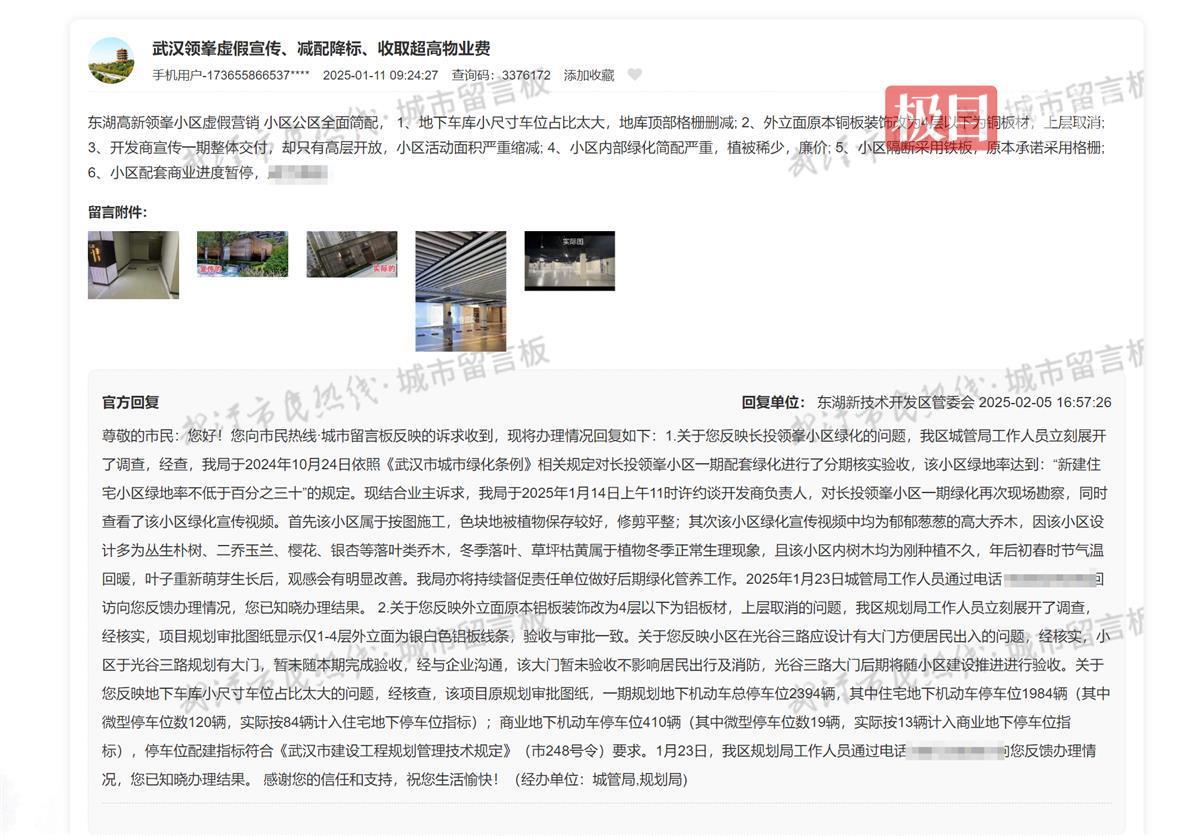 新闻记者注意到,在今年年初,多位业主在武汉城市留言板上反映领峯项目减配等问题。属地有关部门对部分问题给予了回复,其中提到,领峯小区一期配套绿化进行了分期核实验收,该小区绿地率达到:“新建住宅小区绿地率不低于30%”的规定。关于反映外立面原本铝板装饰改为4层以下为铝板材,上层取消的问题,经核实,项目规划审批图纸显示仅1-4层外立面为银白色铝板线条,验收与审批一致。关于反映地下车库“小尺寸车位占比太大”的问题,经核查,停车位配建指标符合《武汉市建设工程规划管理技术规定》(市248号令)要求。