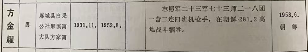 烈士方金耀是湖北省原麻城县白果公社麻溪河大队方家河人,1931年11月生,1952年8月参加革命,生前是志愿军二十三军七十三师二一八团一营二连四班机枪手,1953年6月,在朝鲜281.2高地战斗中牺牲,年仅22岁。