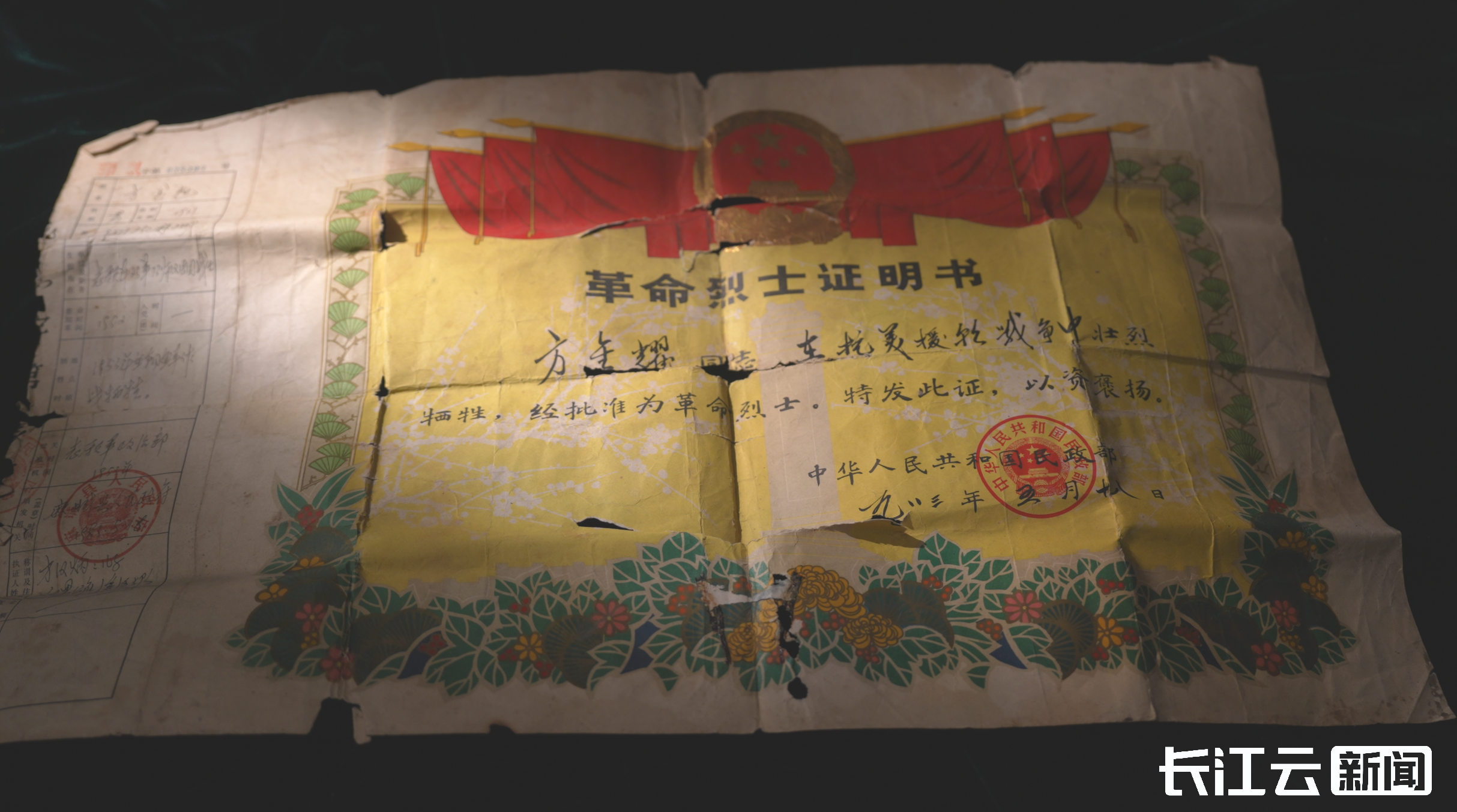 在方汉炳家里,爸爸留下的唯一物件就是这张革命烈士证明书。想爸爸的时候,方炳汉就会拿出来反复观看。一年年、一次次的翻阅,方炳汉已经把烈士证明书抠出几个破洞。