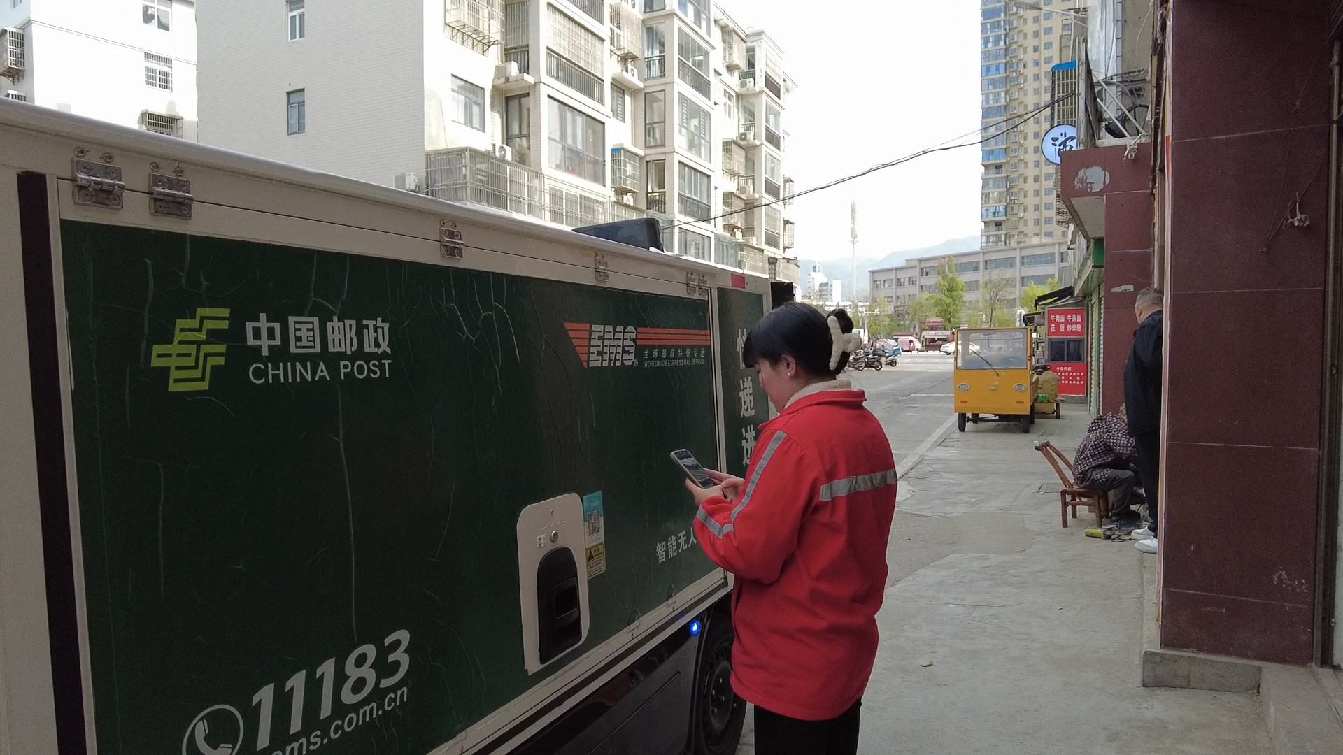 高敏是一家快递网点的负责人,她对这位“新同事”十分满意。20分钟前,她接到了无人快递车的电话通知,便早早地等候取货。车一到,她就熟练地扫描车身二维码,开门、取货、搬货,几分钟时间就完成了取件,大大提升了快递配送时效。高敏说:“自从有这个快递车后效率更高,时间更方便,能尽早地把快递从物流仓库送到店里来。”