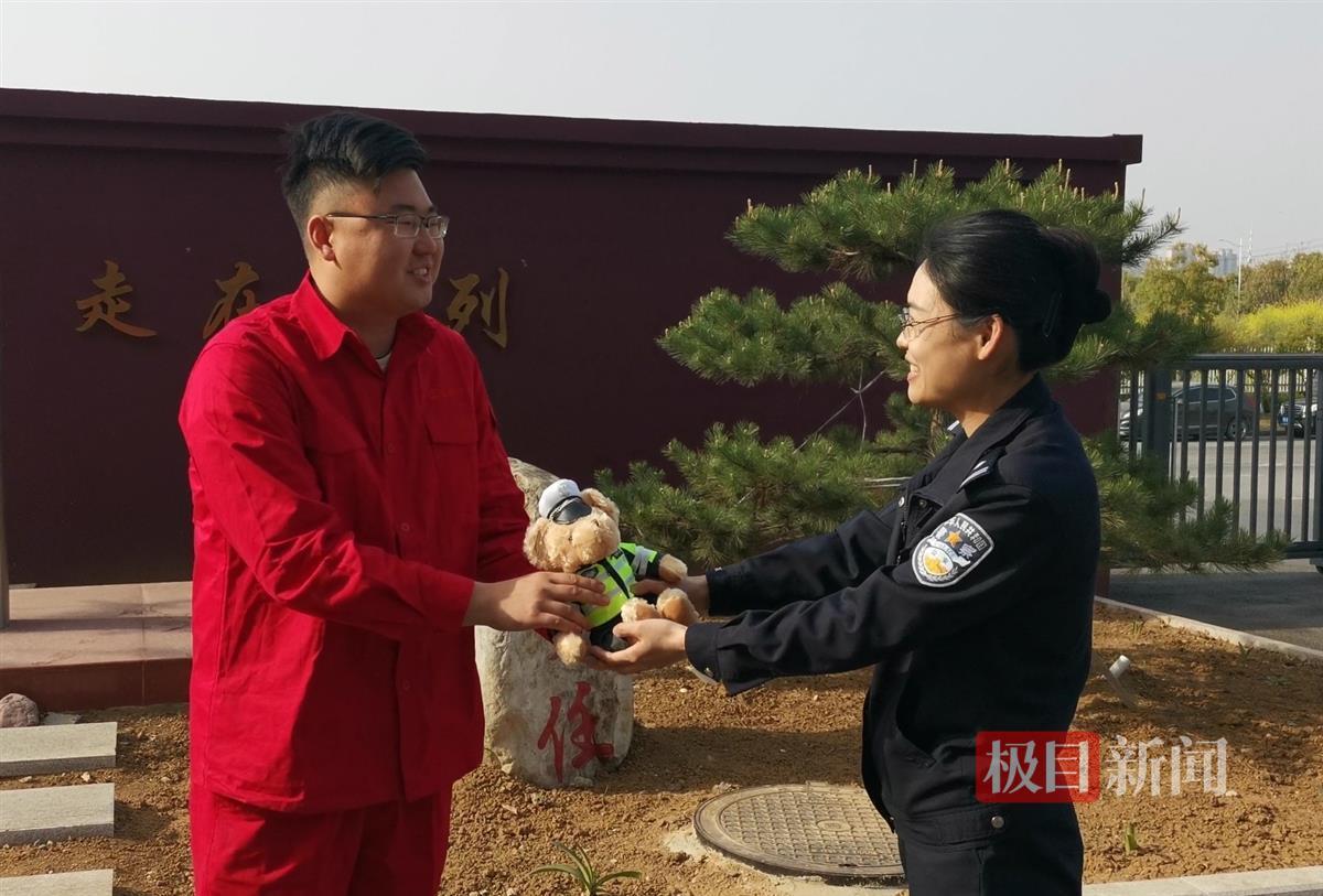 襄阳市襄州区公安局民警为郑子文送上交警小熊
