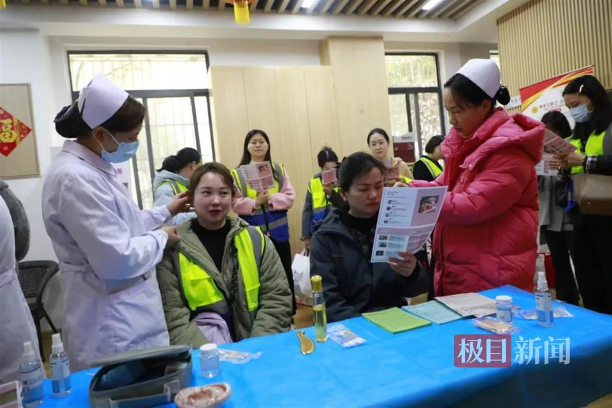 武昌区中华路街都府堤社区区域性职工之家(工会驿站)邀请医疗团队为女职工提供免费健康咨询、把脉问诊及肩颈推拿服务(本图由湖北省总工会提供)