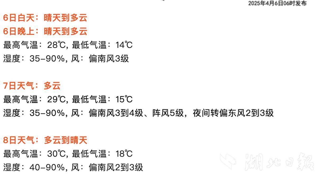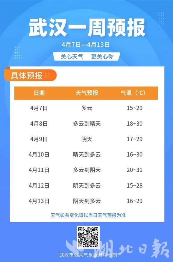 湖北日报讯(记者汤炜玮、通讯员陈声超)4月6日,从武汉市气象局获悉,预计未来一周,武汉市以晴或多云为主,气温将继续回升,午后最高气温都在30℃上下徘徊。
