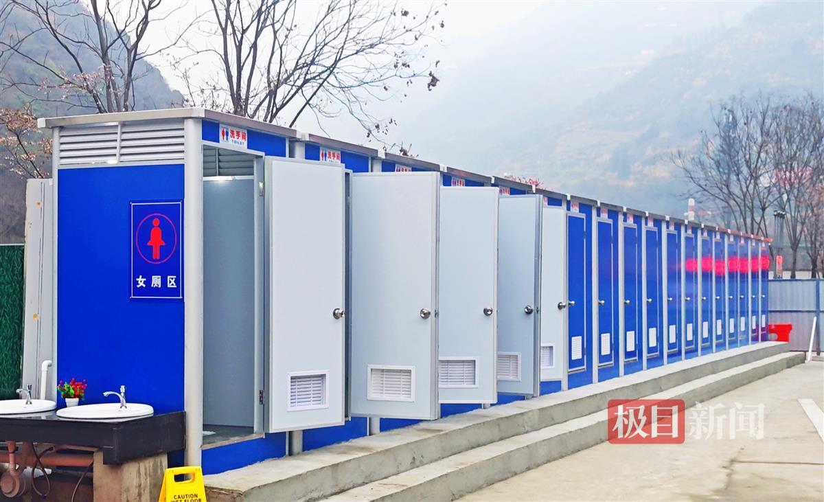 所有临时卫生间采用轻钢结构搭建,女厕位和男厕位按2:1配比。在野三关、兴山等大流量服务区,女厕位占比达75%。临时卫生间配备独立冲水系统、防水隔板、临时照明及24小时保洁,高峰期每半小时保洁使用消毒液进行清洁。