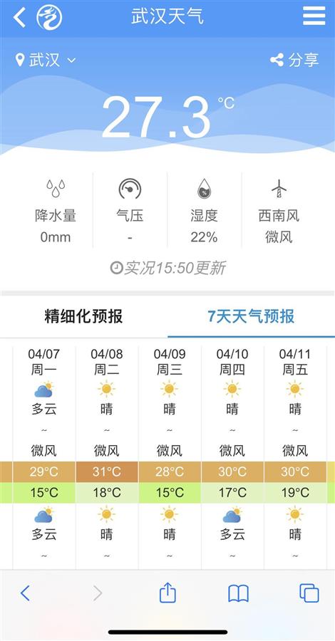 具体来看,武汉周一多云,15-29℃,周二多云到晴天,18-30°C,周三晴,15-28°C,周四晴,17-30°C,周五晴,19-30°C。