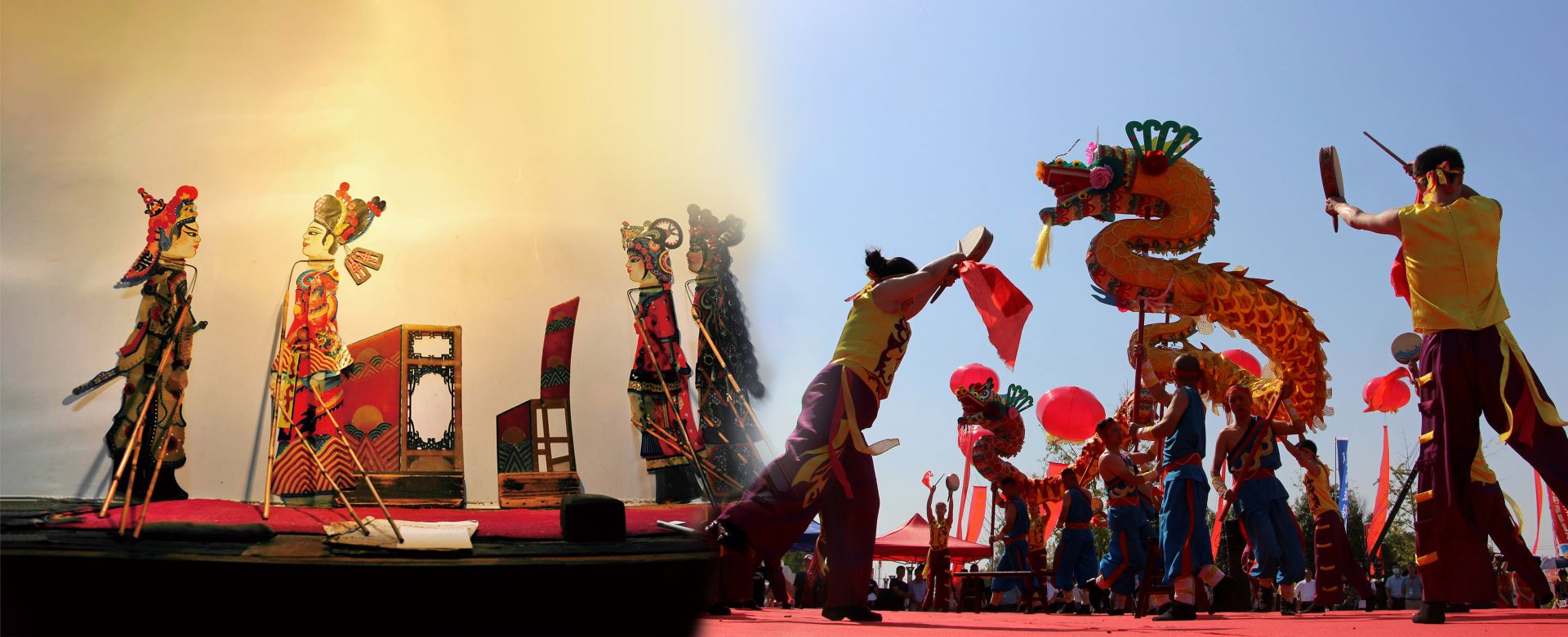 皮影戏(左)与三节龙·跳鼓舞(右)。通讯员 供图