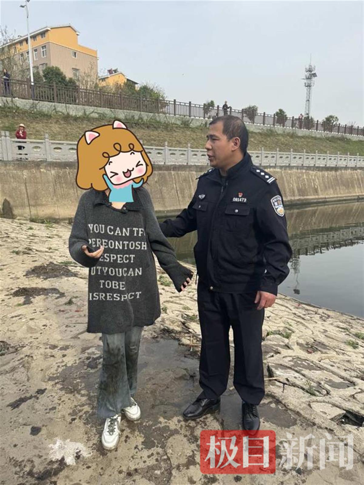 经过一番努力,民警吴长都和辅警周博伦终于靠近了落水的程某。
