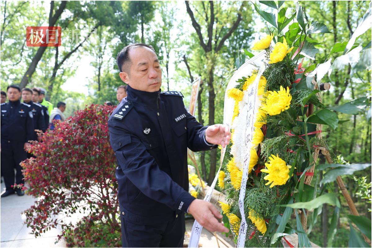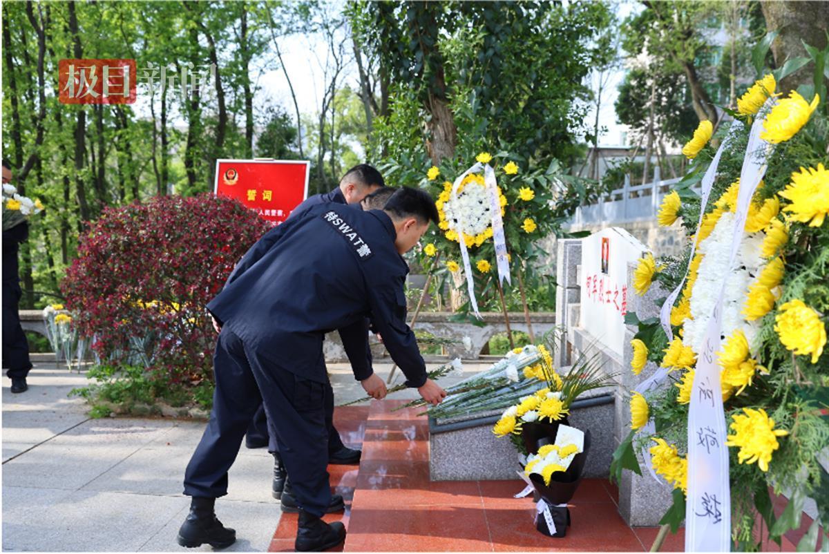“我是中国人民警察,我宣誓:坚决拥护中国共产党的绝对领导……”全体民辅警振臂握拳,重温人民警察誓词。铿锵声声,表达坚定的理想信念和忠诚担当,一字一句是职责也是使命。全警肃立默哀,伴随着深情的《献花曲》,礼兵迈着整齐的步伐走向烈士碑前献上花圈,易一鹏同志缓缓上前整理缎带。大家列装整齐,缓步向前依次瞻仰了公安英烈墓,将鲜花敬献于纪念碑前,向革命先烈们致以最崇高的敬意。