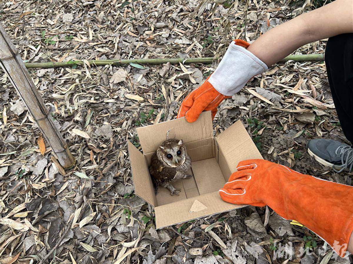 3月27日上午,远安县野生动植物保护站接到汪家村村委会求助,称一只形似“猫头鹰”的鸟类飞入会议室。工作人员迅速赶赴现场,经鉴定确认其为国家二级保护动物——角鸮。经过细致检查,该角鸮体表无外伤,飞行与跳跃能力正常,推测它可能因误入室内难以脱困。在确认其符合放归条件后,工作人员选择汪家村附近生态环境良好的山林作为放生地点。放生过程中,角鸮迅速展翅高飞,重返自然栖息地。