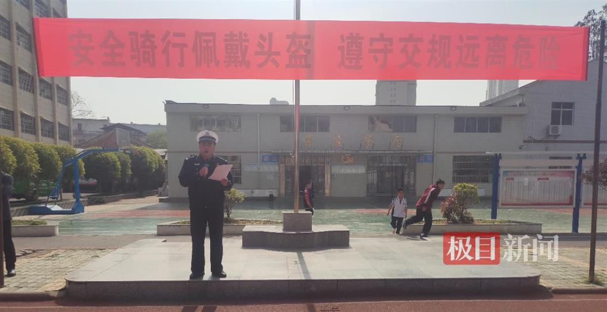 活动中,民警以简洁明了、通俗易懂的语言,结合校园周边较为复杂的交通状况,以及学生们普遍的交通出行方式,向师生们认真讲解了步行和骑乘电动车等上放学期间需注意的交通安全常识;特别强调年满16周岁才能骑电动自行车,并要佩戴好安全头盔,提醒同学们不要在马路上追逐打闹和并驾齐驱。