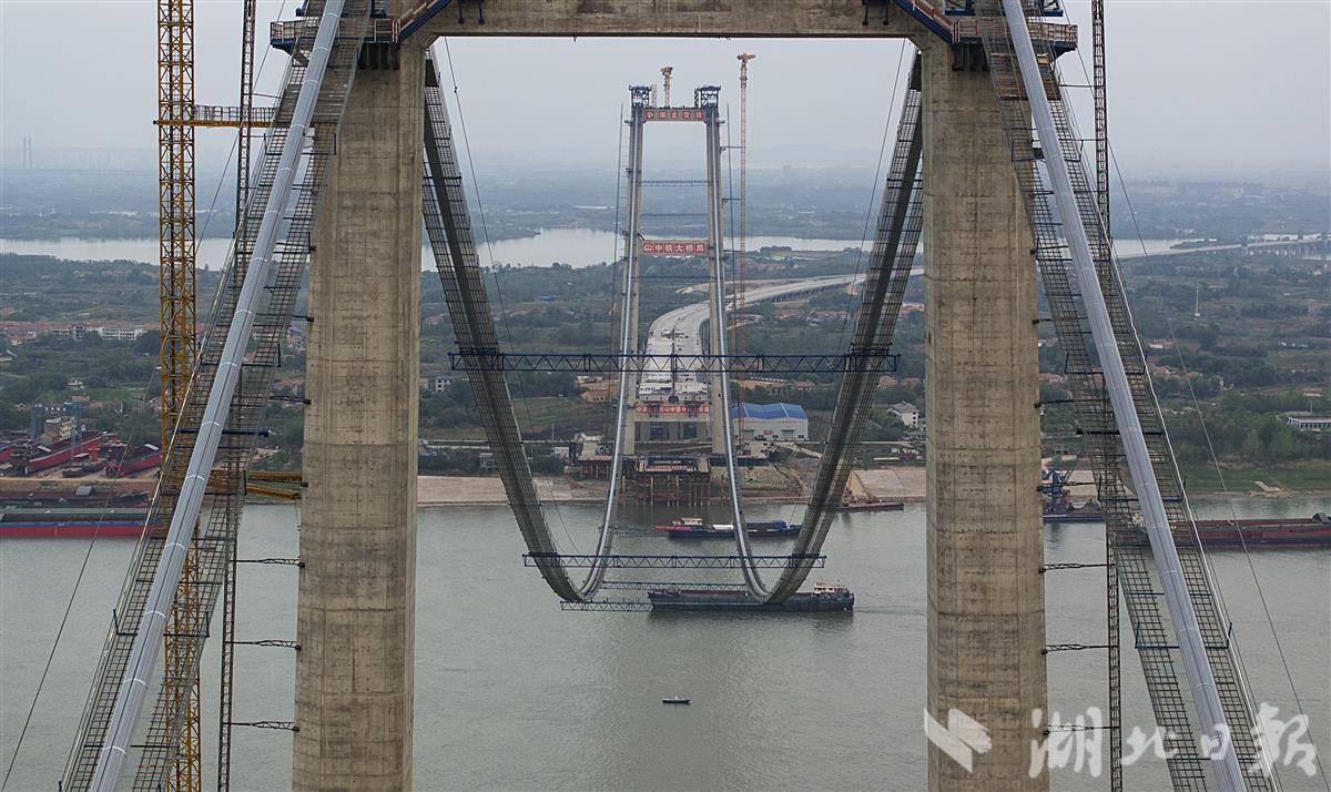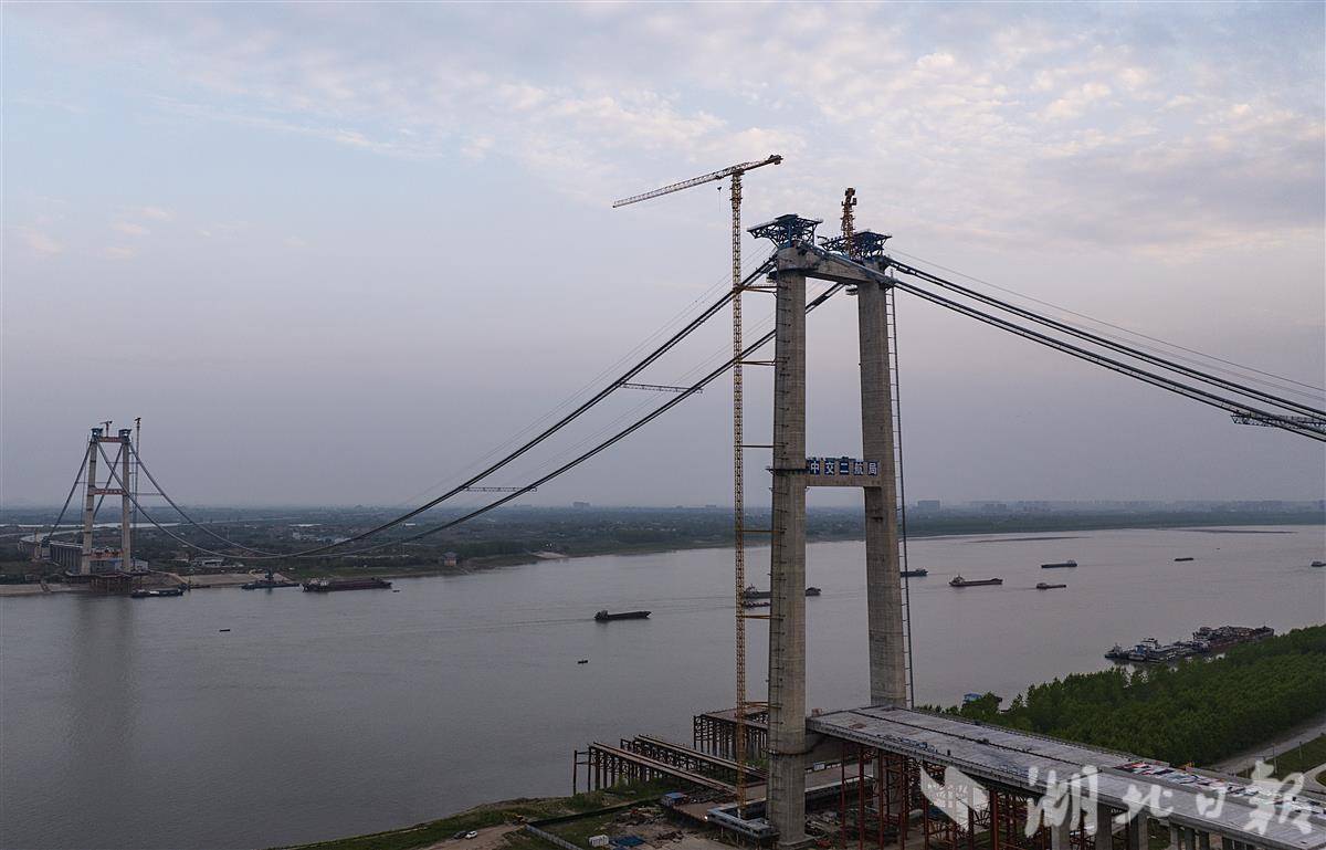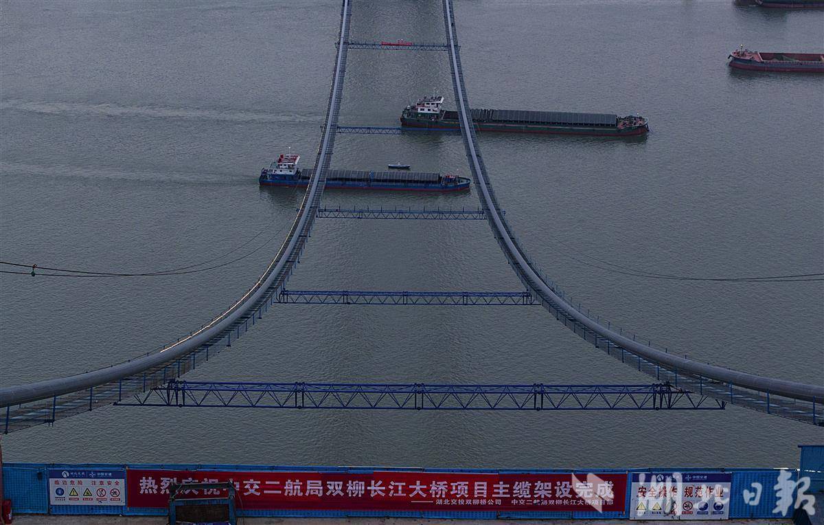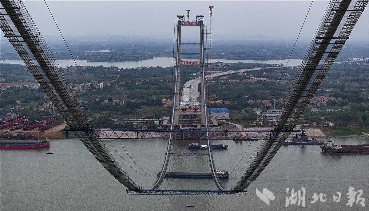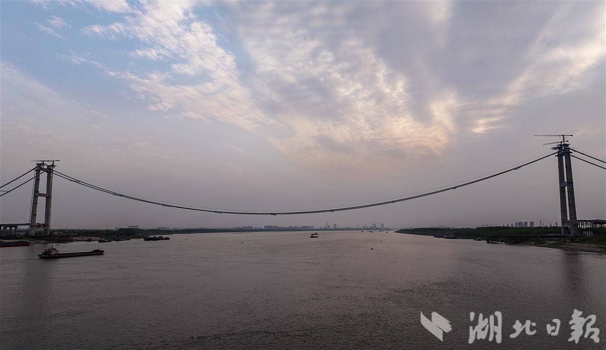 4月9日,鸟瞰武汉双柳长江大桥,目前该桥已顺利完成主缆架设,大桥即将进入钢箱梁吊装施工阶段。主缆架设是悬索桥上部结构施工中至关重要的一环,是悬索桥重要的受力构件。双柳长江大桥共设有2根主缆,每一根主缆由169根索股组成,直径约1米,重约1.2万吨。