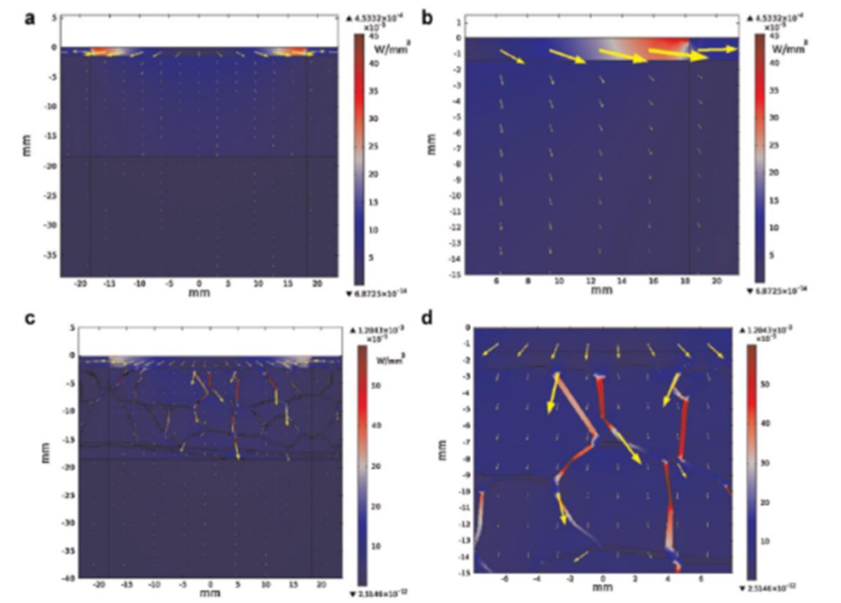 图1:总电能吸收(表面分布)和电流密度(箭头):(a)均一皮下脂肪,F;(b)特写,F;(c)皮下脂肪组织与纤维间隔,F + SP;(d)特写,F + SP。