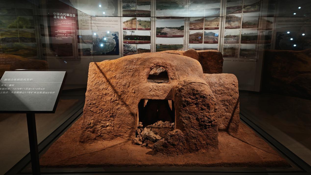 在“炼铜有方”展厅里,一件特殊的“国宝”引人驻足:看来只是黄泥筑起的一座土炉灶,却凝聚着古代矿冶工匠们的智慧。熊熊炉火中,矿石熔炼为铜锭,成为青铜器铸造的主要原料。这便是铜绿山遗址发掘的6号炼铜竖炉。