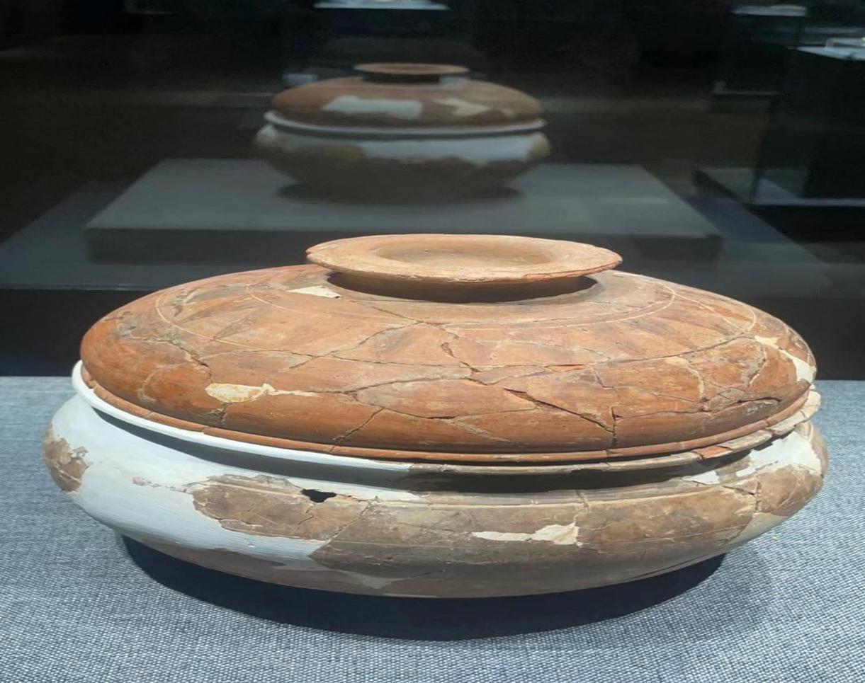 作为镇馆之宝的带盖陶盂通常用于盛水或食物,是古代的生活用品,反映了楚人的生活方式和文化习俗。盖上朱饰一圈光芒纹,反映了楚人对太阳的崇拜,其形制反映了外来楚人和本地杨越人的民族融合过程。