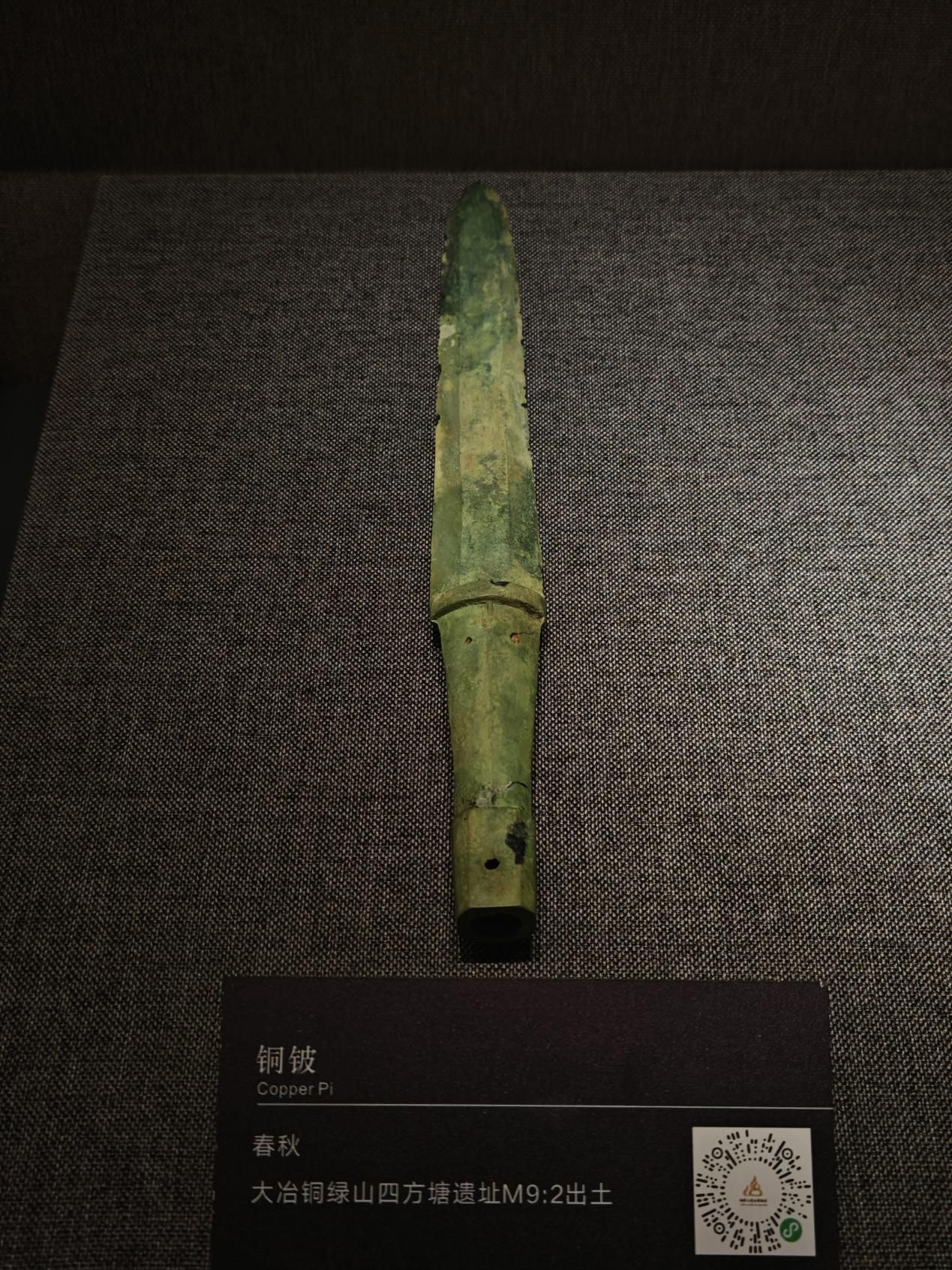2014年出土于四方塘遗址墓葬区M9的铜铍出现于春秋晚期。铍是剑的前身,纹饰精美,呈深绿色,整体较短,铍身呈长条三角形,前窄后宽,宽平脊,刃部十分锋利。器体通长30.1厘米(原文缺少单位)。此铍经检测分析含铜仅为13.71%,含锡(增强硬度)达76.05%,含铅(增加延展性,纹饰更精致、增加重量)为2.33%。此铍的铸器铜料来自铜绿山,说明铜料用于“国之大事,在祀与戎”。