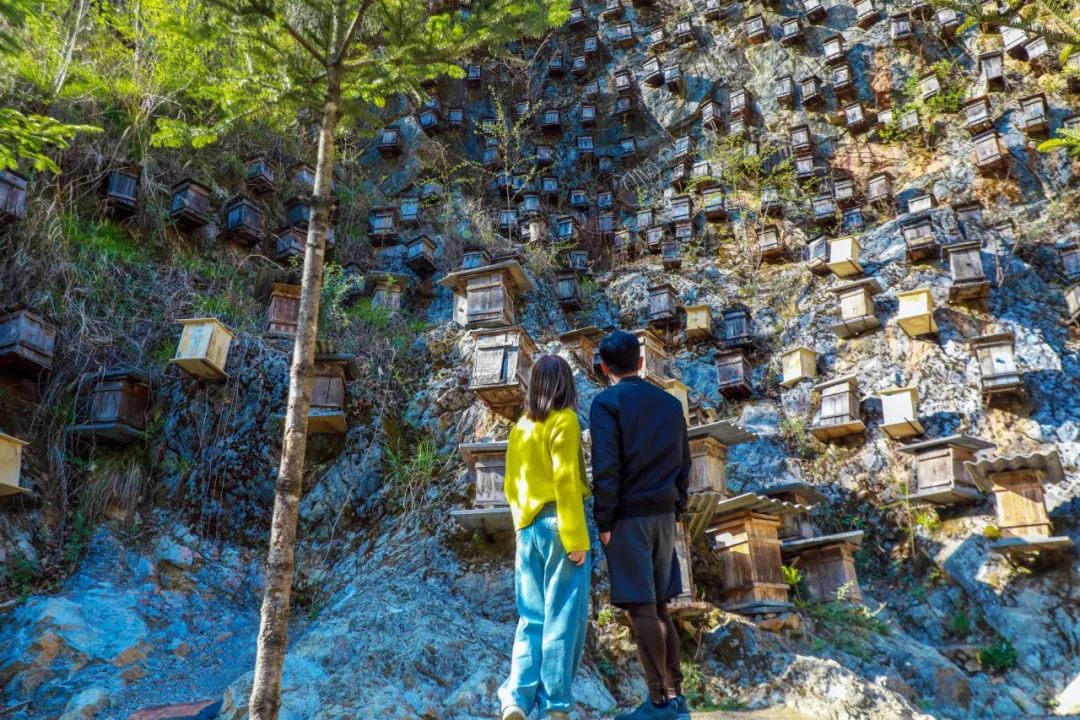 拍摄组一行人来到了官门山,这里有一处独特的景观——悬崖蜂箱。