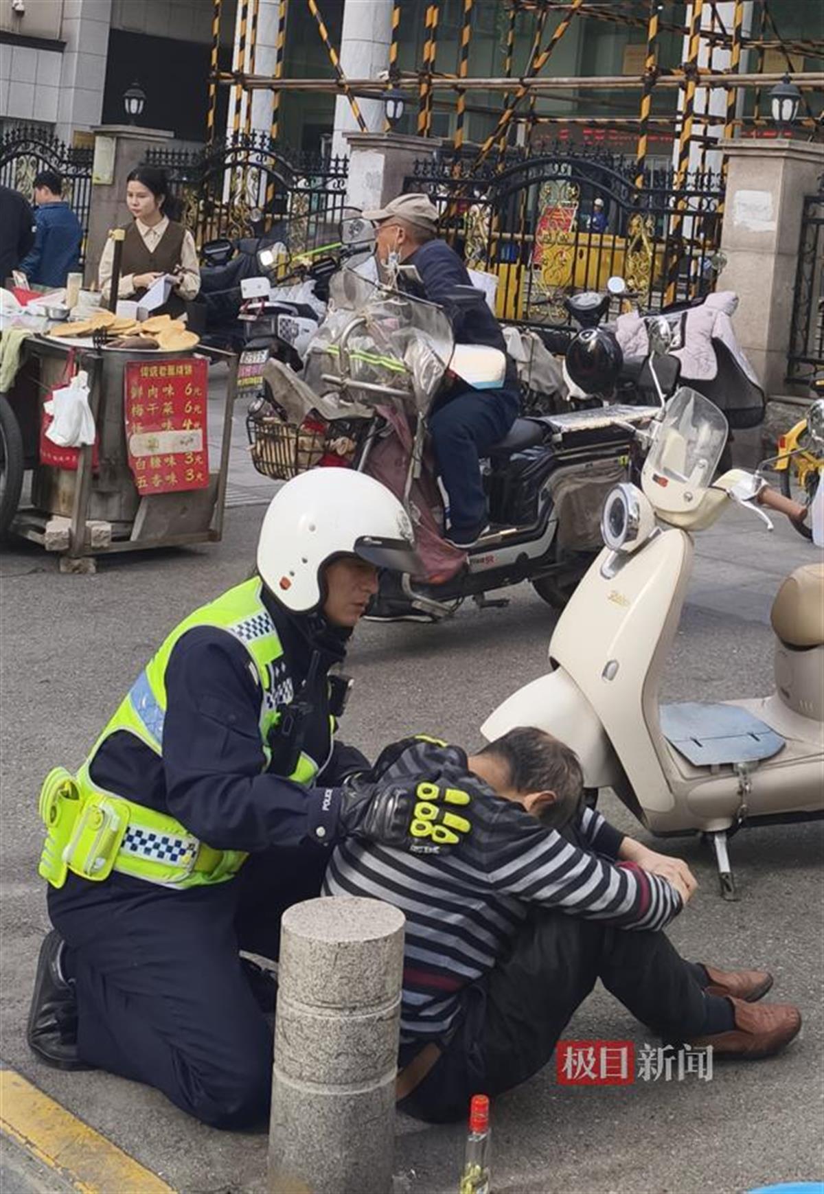 当天下午4:30,武汉市硚口区公安分局交通大队民警杨彬骑着摩托车巡逻到利济北路公交车站附近,发现一男子躺在地上不省人事,旁边车来人往,很不安全。他立刻上前查看,一股刺鼻的酒味扑面而来,男子身旁还放着一瓶尚未喝完的白酒。