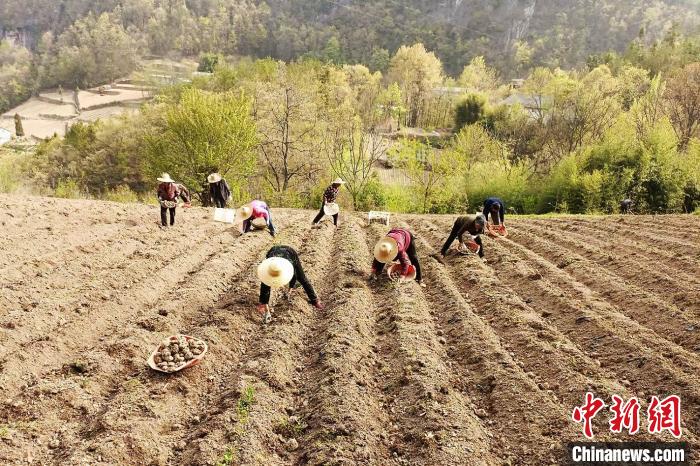 暮春四月,在湖北省长阳土家族自治县榔坪镇马坪村,长阳深山种田种植专业合作社负责人杨波带着50余名农户,将魔芋种子分批放入田垄,抢抓魔芋播种期。