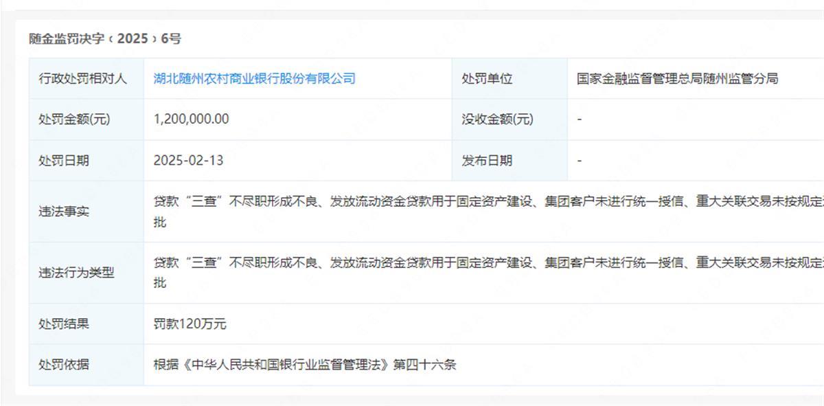 3月28日消息,据国家金融监督管理总局随州监管分局行政处罚信息公开表显示,湖北随州农村商业银行及相关责任人因贷款“三查”不尽职形成不良、发放流动资金贷款用于固定资产建设、集团客户未进行统一授信、重大关联交易未按规定进行审批等,随州农商行被罚款120万元。对责任人孙克强给予警告。